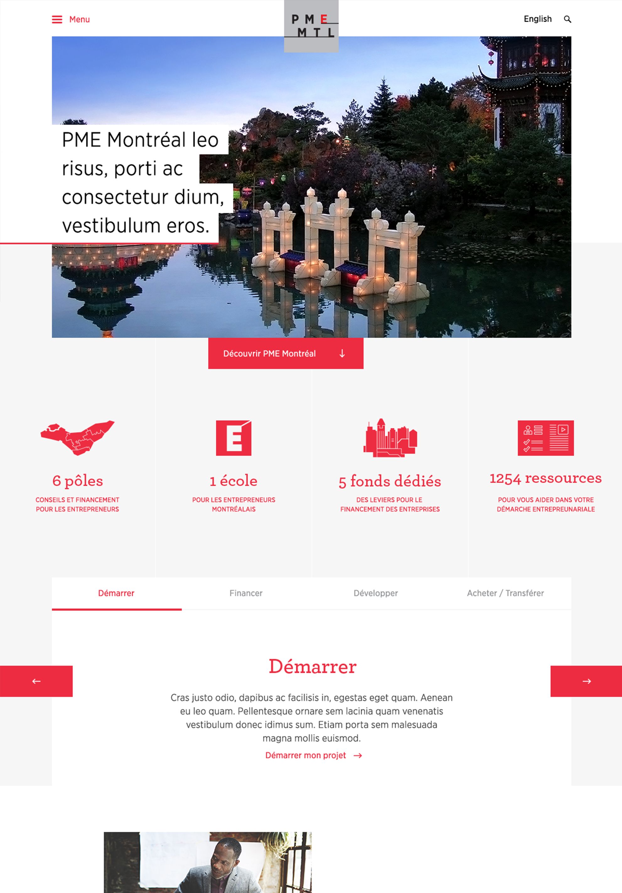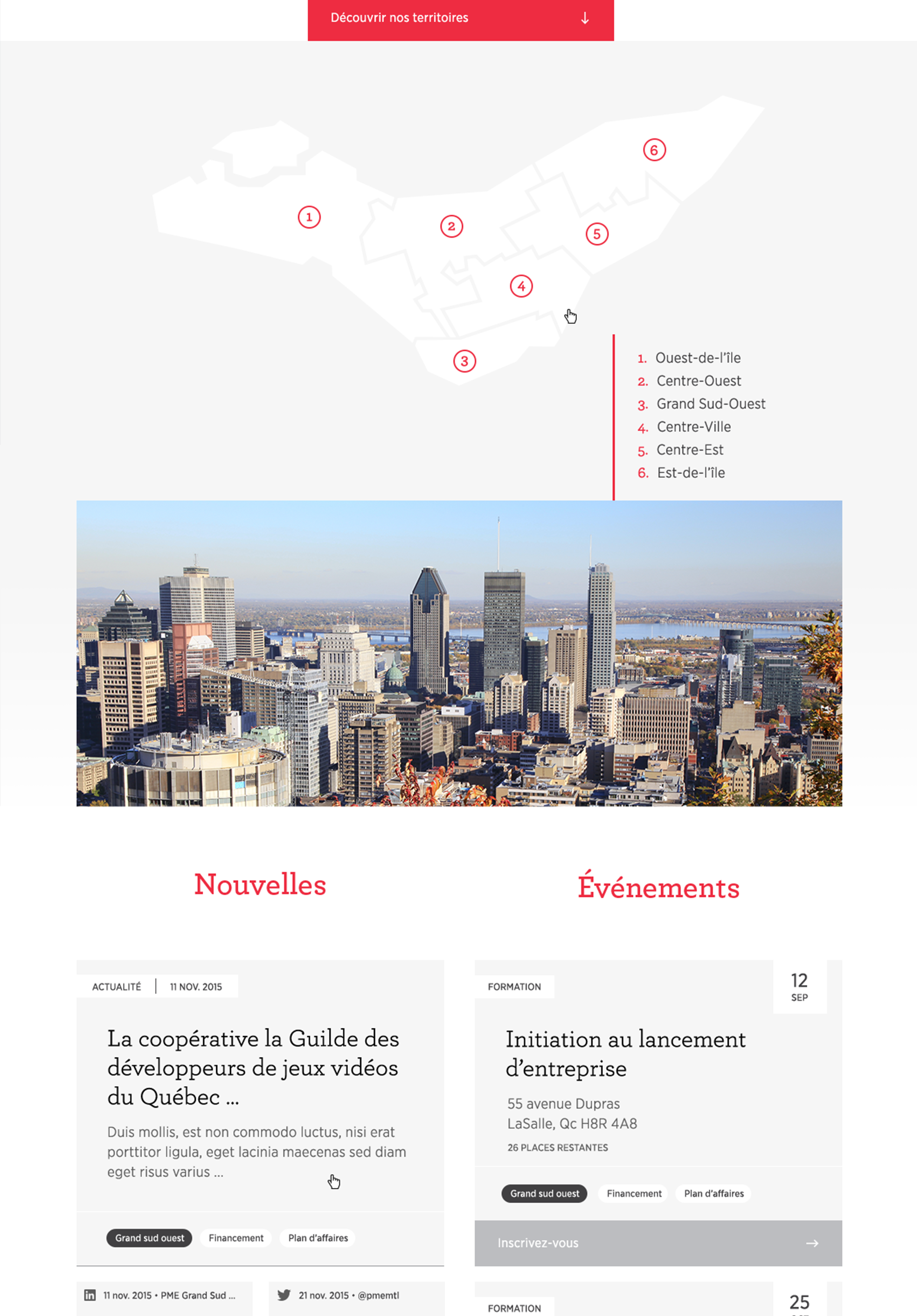 Direction artistique et design du site internet de PME Montréal, structure institutionnelle spécialisée dans l’accompagnement et le financement de projets entrepreneuriaux.